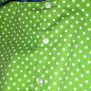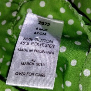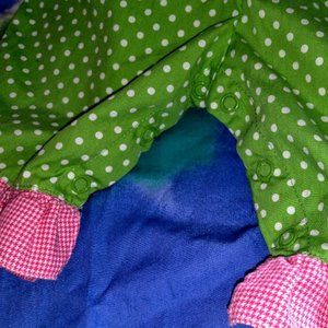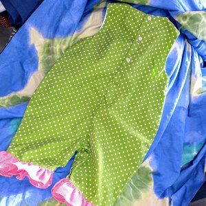 In excellent condition, this beautifully appliqued dotted green bubble romper is sure to be a hit this Spring. FABULOUS for Summer season. Precious pink gingham ruffle cuffs at hems. Sleeveless to be worn as is in the heat or a shirt or blouse beneath for cooler nights or inside air conditioning. Three-button placket at back and full-snap leg-liner for easy diaper changes. Size 6 months, all-cotton, lined thru the bodice. SFPF home.