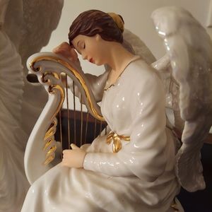 2 white ceramic angels for decorative use and collectors. One has harp and the other one is singing. Appropriately 8" . They have lots of detail from their fingers to their toes.