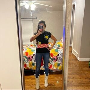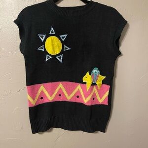 Oak Bluff • Vtg Black Sweater Vest Sun Camel Geometric Design Sz Sm—ADORABLE