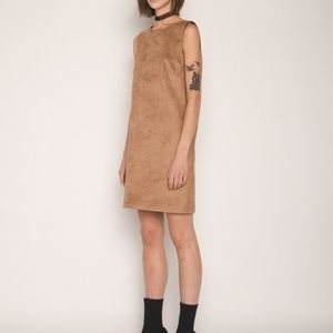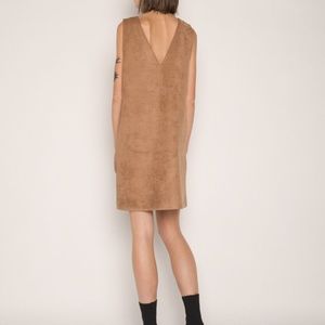 The simple suede dress features a shift silhouette that is bound to be flattering on everyone. The v-neck at the back adds a demure touch to this feminine piece. Ever so versatile, this dress can be worn out on its own or layered for a daytime look. Layer over a turtleneck and style with a denim jacket and sneakers for an effortlessly chic and casual everyday look.