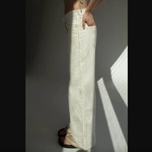 Oak + Fort Cream Straight Leg Twill Pant with Frayed Sides 4. These straight leg twill pants are made in a relaxed fit and has a mid-rise waist. It has a 5-pocket design and is detailed with fraying on the sides. Pair yours with a lightweight knit and heels. Stretch cotton twill. 5-pocket design. Frayed sides. Relaxed fit. Long length: 30" inseam intended to create a pooling effect. Straight leg cut. Mid-rise waist. waist is 15" across, rise 11".