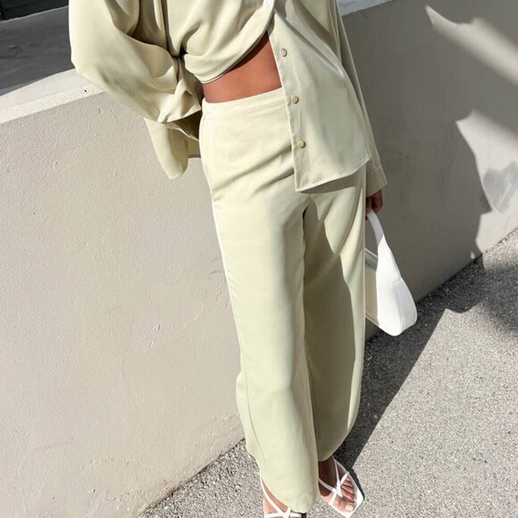 These straight leg satin pants are cut in a relaxed silhouette and is elasticated at the waist for a comfortable fit. A go to style you will be wearing all season long with ribbed tanks or wear it as set with Button Up Blouse.