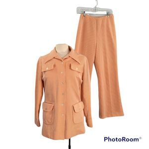 Vintage 60's 70's womens double knit polyester leisure suit. Orange and white vertical stripe, like seersucker.