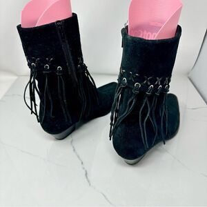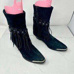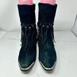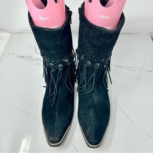 Zip-up suede boots from Oak Tree Farms. They feature stainless steel toe plates, fringe, and are a size 8.5.