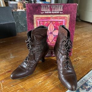 Victorian western chic plus comfort! Versatile, stylish kid skin boots, lightly worn, longly stored. Mild scuffs to be buffed away. Interior trim is peeling but leather is fully in tact, no flaws. For a narrow-look boot these are astonishingly comfy and soft! Original box included.