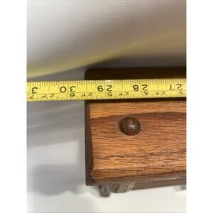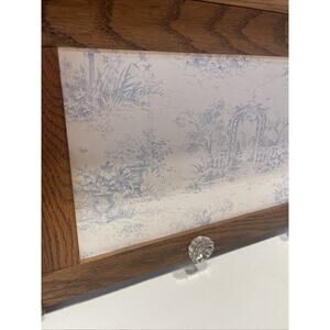 This product is a country style floating shelf made of solid oak wood with a medium brown tone, stained. There are 3 knobs for hanging coats or hats. As a backdrop there is a garden scene wallpaper applied to the wood.