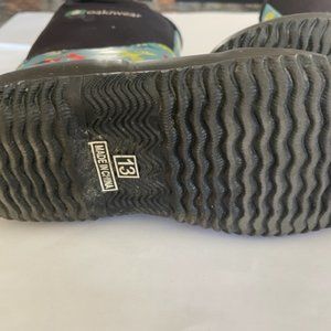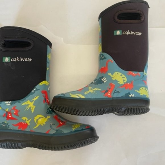 Oakiware kids size 13 rainboot with dinosaurs. Neoprene and rubber pull on boot with hand grips. Barely used. Look almost brand new
