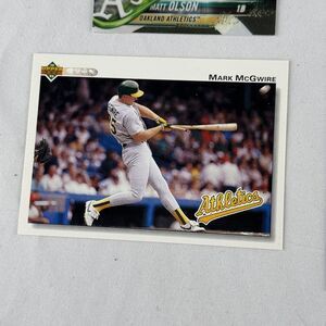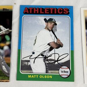 The product is an Oakland A's 12-card lot of sports trading cards featuring players such as Eric Chavez, Matt Olson and Mark McGwire. Among the cards, there is an autographed card of Eric Chavez and a rookie cards of Sean Murphy.