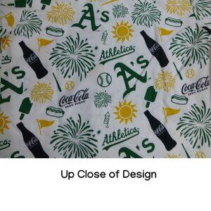 Description: Pre-Owned and still in great condition. Short Sleeves. Button Up. Graphic all over includes the A's logo, fireworks, and coca cola. Limited game day giveaway.