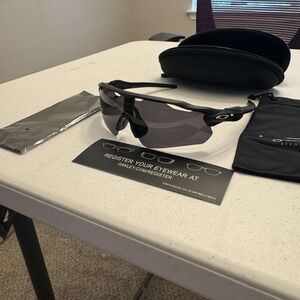 Sleek Oakley sunglasses with a modern design. Black frame and lenses. Includes protective case and pouch.
