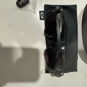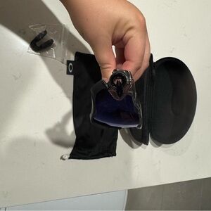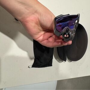 Stylish Oakley sunglasses with a sleek black frame. Features purple-tinted lenses. Includes protective case and pouch.