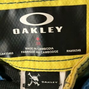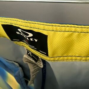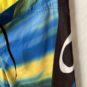 Dive into style with Oakley's vibrant swim shorts. Featuring a striking blue and yellow design, these shorts are perfect for any beach day.