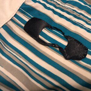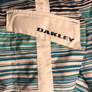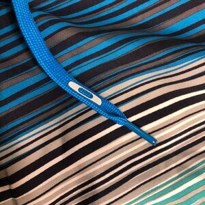 Good pre-owned condition. Vibrant blue, turquoise, and gray striped pattern. Features the iconic Oakley 'O' logo on the leg, grommet fly with bright blue branded drawstrings, and a velcro pocket. No liner. Fabric has light wear consistent with normal use, but no major flaws, rips, or stains. Logo on lower left leg partially detached (see pictures). Priced accordingly for detached logo.