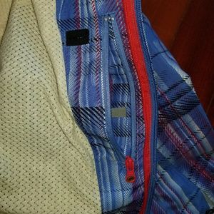 EUC Oakley Checked Out Snowboard jacket with removable inner fleece lining. Snap buttons on waist for fit adjustment. Armpit zipper vents. Two large pockets with zipper and Snap button closure. Small pocket on left wrist. Inside pocket on right side with Velcro closure. Inside pocket on left with zipper closure, has an additional pocket inside of that for media player with Velcro closure and hole for headphones. Inner fleece lining jacket can be removed and worn separately, has 2 large pockets
