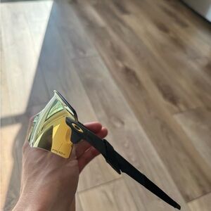 Dynamic Oakley sunglasses with a bold yellow lens. Ideal for sports and outdoor activities.