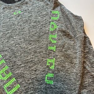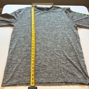 Gray long sleeve tee by Oakley. Features vibrant green lettering on sleeves. Perfect for casual wear. Cool soft feel.