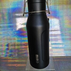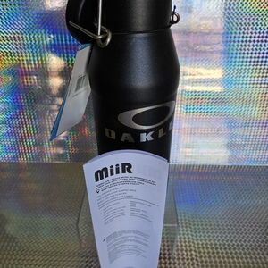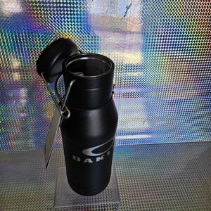 Matte black Oakley bottle featuring a bold silver logo. Ideal for active lifestyles. Stainless, double walled