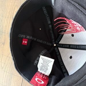 Oakley cap with bold red logo. Sleek black design. Perfect for casual wear.