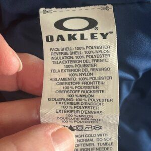 The Oakley puffer vest offers warmth with its insulated design and reversible feature. Crafted from polyester and nylon, it's ideal for cold weather. Blue side has open pockets and Oakley black metal logo. Gray side has zippered pockets.