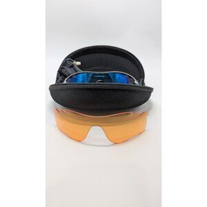 Oakley Silver/Blue Radarlock Path Sunglasses. Gently used, with some scratches. It includes an additional orange filter that can be attached or removed from the front lens. It also includes a protective pouch and carrying case.