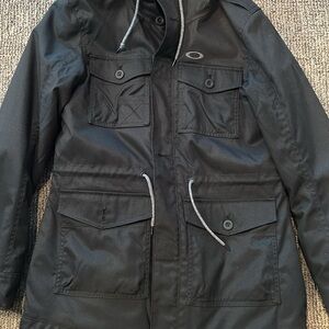 Oakley snowboard jacket. Longer length with cute button detail. Adjustable waist so you can make it a bit more figure flattering if desired. Fur hooded collar (non detachable). Insulated. Black. Size S.