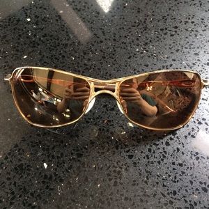 Metal aviator frames from Oakley STYLE : crosshair COLOR : Gold frames with brown lenses CONDITION : small scratches on both lenses earpiece still has some glue from the sticker tag