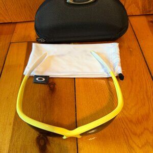 Stylish Oakley sunglasses with a vibrant yellow frame. Sleek black lenses. Comes with a protective case and pouch.