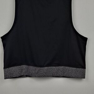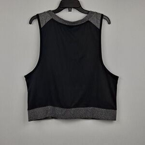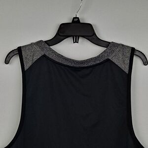 Called an Exhale pullover, this top is black and gray, size medium. Large open neck and armholes, taped and trimmed seams. 60% cotton, 40% polyester.