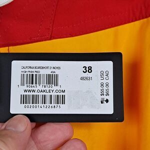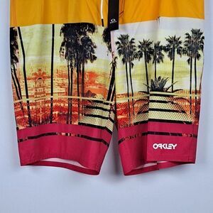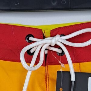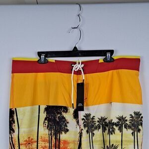 Colorful, tropical theme, size 38. Laced tie front with one rear zipper pocket. Measures 40" waist, length is 21".