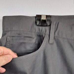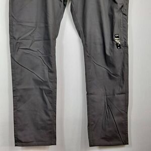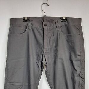 Medium gray, size 40. Classic 5pocket style with straight legs and zipper fly front with button. Last leg has zipper pocket for sun glasses etc. Measures 40" waist, inseam is 32". Fabric is 60% cotton, 36% polyester and 4% spandex.