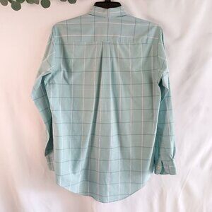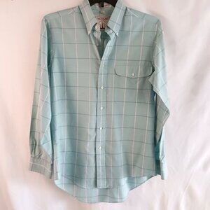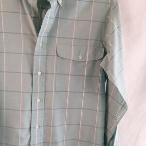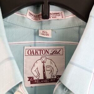 Classic and comfortable, this Oakton Ltd men’s dress shirt features single-needle tailoring for a clean, refined finish. Relaxed fit for all-day comfort. Size 15 1/2 neck, 34-35 sleeve. Light green plaid pattern adds subtle style that works for business or casual looks. Excellent pre-owned condition with no stains, rips, or flaws.