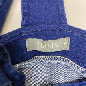 Adorable dress from Oasis. Overall style denim dress in a dark wash with straps that button instead of buckle. Seams at chest and waist for a more tailored fit. Two hip pockets. Back zipper closure. Has stretch. Super versatile! Wear as is or layered over a tank, tee or pair with a turtleneck, tights and boots for colder months. Great quality! All measurements are approximate, taken flat and closed.