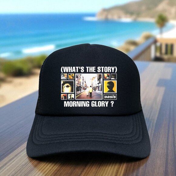 Oasis What's The Story Morning Glory Mens Trucker Hat Black Snapback Ball Cap