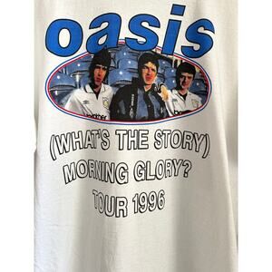Oasis "What's the Story Morning Glory?" Vintage Reprint Single Stitch T-shirt Oneita Tag. The size is stated in the tag as an XL. Please review the measurements provided below for an accurate fit assessment.