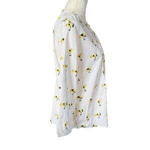 Women's Oat & Fawn cream with black and yellow bird print 3/4 sleeve 1/2 zip blouse, size XS. This is thin, lightweight and pleated with a crewneck and elastic at the wrists. Made in India. 100% Polyester. Smoke free pet free home. Quick shipper!