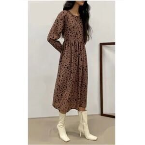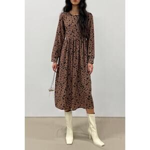 Embrace soft storytelling with this Oat + Fork midi dress in a rich brown floral print. Blending prairie revival, boho, and cottagecore aesthetics, it features a gathered waist, long sleeves, and a flowing mid-calf length. The silhouette is romantic yet grounded—perfect for crisp mornings, dried florals, and boots on leaf-strewn paths.