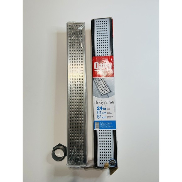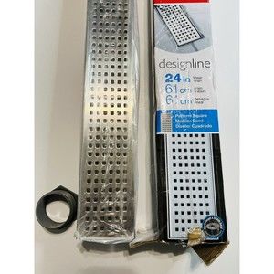 New open box Oatey Designline 24 in. Stainless Steel Linear Shower Drain with Drain Cover. Does not include lifting hook. All other parts included as shown.