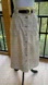 Crisp linen & cotton blend skirt in a neutral color like oatmeal. Buttons all the way down the front for more or less coverage; all buttons are present & attached. Fitted, non-stretch waist. Interior front has an additional button so the closure sits correctly. Largish patch pockets borrow from workwear; also has belt loops (belt not included). Well-cared-for, good condition, but possibly vintage sized so please check measurements.