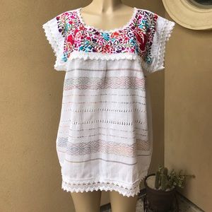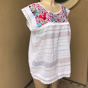 Amazing Mexican top! White loom-made fabric (100% Handmade work) with multicolor floral embroidery with birds and leafs. Lace accents on hemline, chest and sleeves. Breathable garment. Mannequin is size S/M. Blouse is one size and fits XL up to 2XL. Measurements: Armpit to armpit 22.5" Lenght shoulder to hemline 29" Width hips area 52"