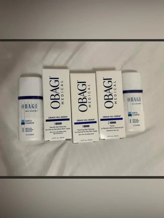 Obagi travel bundle includes 3 gentle cleansers, 1 toner and 1 foaming cleanser. Some are in the brand new packaging. All brand new.