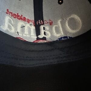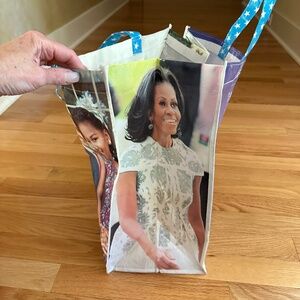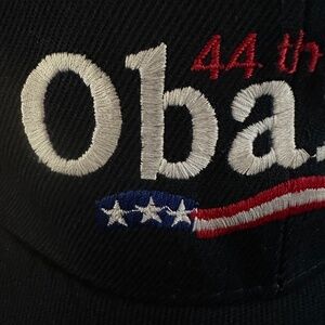Obama Hat Cap and Obama Shopping Bag Shopping Tote. Navy blue ball cap commemorating election of Barack Obama on Nov. 5, which is embroidered on left side of hat. 44th President embroidered in red on front of hat along with Obama embroidered in white and a red, white and blue banner embroidered under Obama. Adjustable velcro strap. Cap made of 80% wool and 20% acrylic. Also included is a glossy, dual handles shopping tote. Five images on the tote as seen in the pictures. Small break in one corner of the tote (pic 10.) Hat and tote are clean.