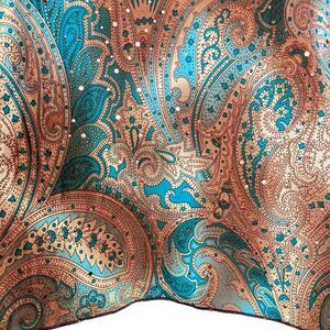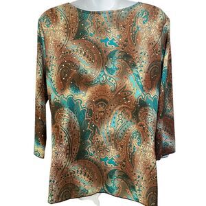 This Obe Vintage Y2K Paisley Babydoll top in size 1X features a V-Neck with a whimsical fairy aesthetic. The knit top is adorned with sequins and a bow accent, giving it a touch of glamour. The 3/4 sleeves and wide straps make it suitable for various seasons, while the brown color adds a versatile touch to the piece. This blouse with a slit detail offers a regular fit and is perfect for casual or travel occasions with its vintage charm. Made of polyester and spandex, it is machine washable for easy care.