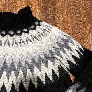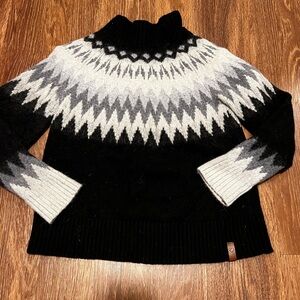This cozy Obermeyer sweater features a high cowl turtleneck design in a striking black and gray color scheme. The upper part showcases a unique zigzag pattern that adds a classic wintry touch, making it perfect for cold weather outings.