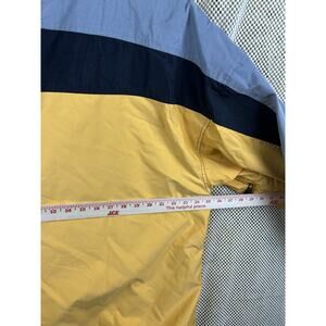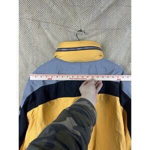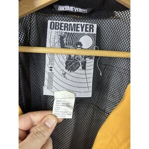This Obermeyer Double Diamond Ski Jacket is a vintage piece made in China. It features a yellow color with a 100% nylon outer shell and lining material. The jacket is long-sleeved and has a long length with a chest size of 50". It is insulated with polyester and fits regularly, making it suitable for men's size XL.