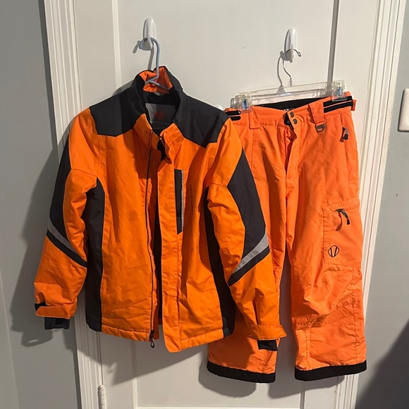 Stylish Obermeyer jacket (XL) with bold orange accents. Ski pants are Sunice (size 10 with adjustable waist band) but selling as a set. Ideal for outdoor adventures.