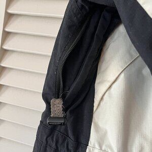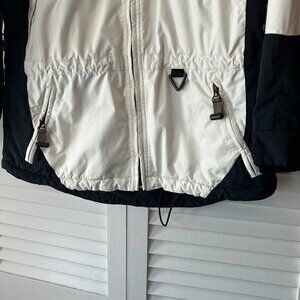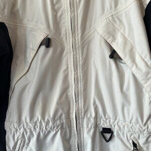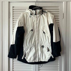Obermeyer women's shell snow ski jacket, cream and black. Size 10. Has hood. Lots of zip-close pockets. Gently worn, in good used condition. Minor signs of wear/washing.
