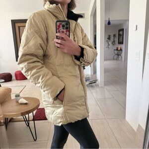 Beautiful & warm jacket from Obermeyer. Soft, satin material on the outside. Many pockets / details throughout to keep you warm and organized. Size 10. Fits size M. Pit to pit 20”. Length 29.5”. Soft, pastel yellow color. Black lining. Hoodie is hidden in the collar. Pre-loved with only couple times wear. Great condition!