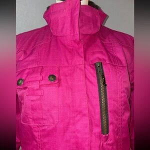 Chic Obermeyer jacket in vibrant pink and sleek black. Ideal for stylish outings.