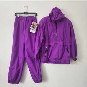 "Step back in time with this fantastic vintage Obermeyer purple Snow/Ski windbreaker set! This includes a women's half-zip hooded anorak jacket fylly lined with multiple zippered pockets, shpulder pads, adjustable waistband and matching pull-on snow pants with insulation, elastic waistband, elasticized and zippered cuffs; inside id pocket; fully lined. The vibrant purple is eye-catching, ideal for rain, ski, outdoor adventures, or just a stylish statement.