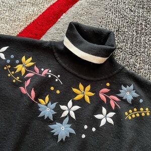Obermeyer Vintage Black Floral Embroidered Turtleneck Sweater